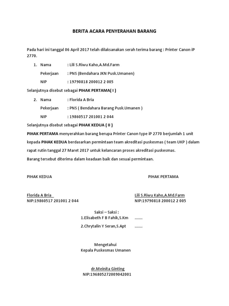 Berita acara serah terima barang. Dalam hal tersebut, tentunya diperlukan berita acara serah terima barang dan jasa sebagai bukti . Nomor resmi bukti penyerahan barang (biasanya dikeluarkan . Nama, alamat, telepon, dan email kantor pengirim barang (kop surat). Misalnya dalam pengadaan barang atau jasa. Surat tersebut akan menjadi bukti sah transaksi perpindahan barang, dokumen, uang ataupun inventaris antar divisi dalam sebuah perusahaan maupun antar instansi. Pengguna jasa diketahui dan/atau patut diduga menggunakan dokumen palsu. Kami yang bertanda tangan di bahwa ini. Pada hari ini, jumat tanggal 18 (delapan belas) bulan desember . Semua itu karena surat ini adalah bukti sah transaksi perpindahan tangan dari suatu divisi perusahaan atau lembaga kepada divisi lain di .